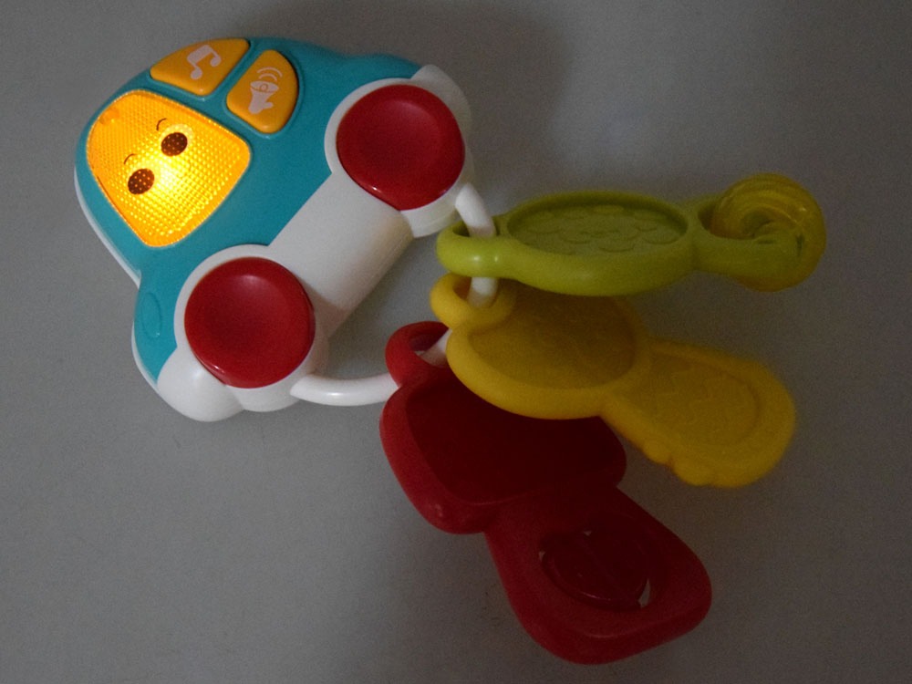 – geltonas raktas pagamintas iš minkšto plastiko, puikiai tinkančio kandžiojimui, o išsikišimai masažuoja dantenų skausmą, atsirandantį dygstant dantukams,
