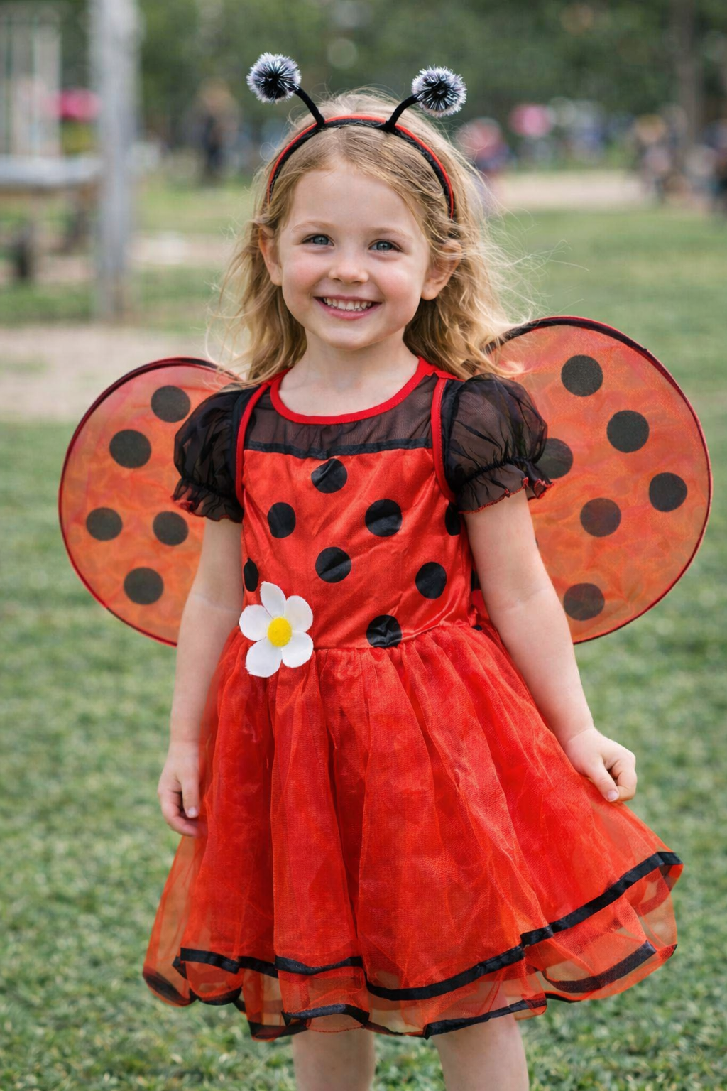 Ryškios raudonos spalvos suknelė dekoruota juodais taškeliais ir miela gėlyte priekyje, o lengvi sparneliai suteikia tikrą boružės įvaizdį. Komplektą papildo lankelis su antenėlėmis – viskas, ko reikia pilnam įvaizdžiui!