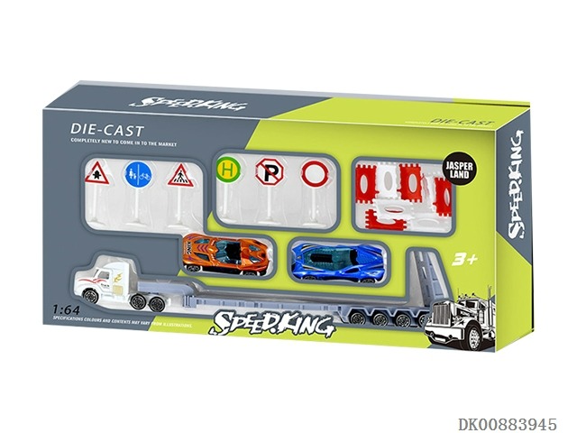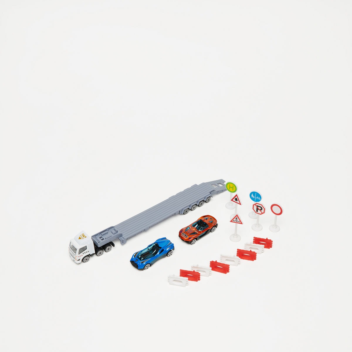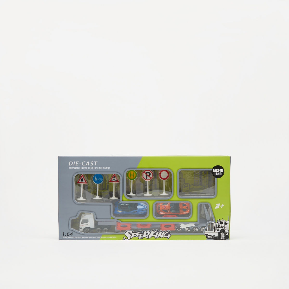 Rinkinį sudaro: sunkvežimis, 2 automobiliai, kelio ženklai